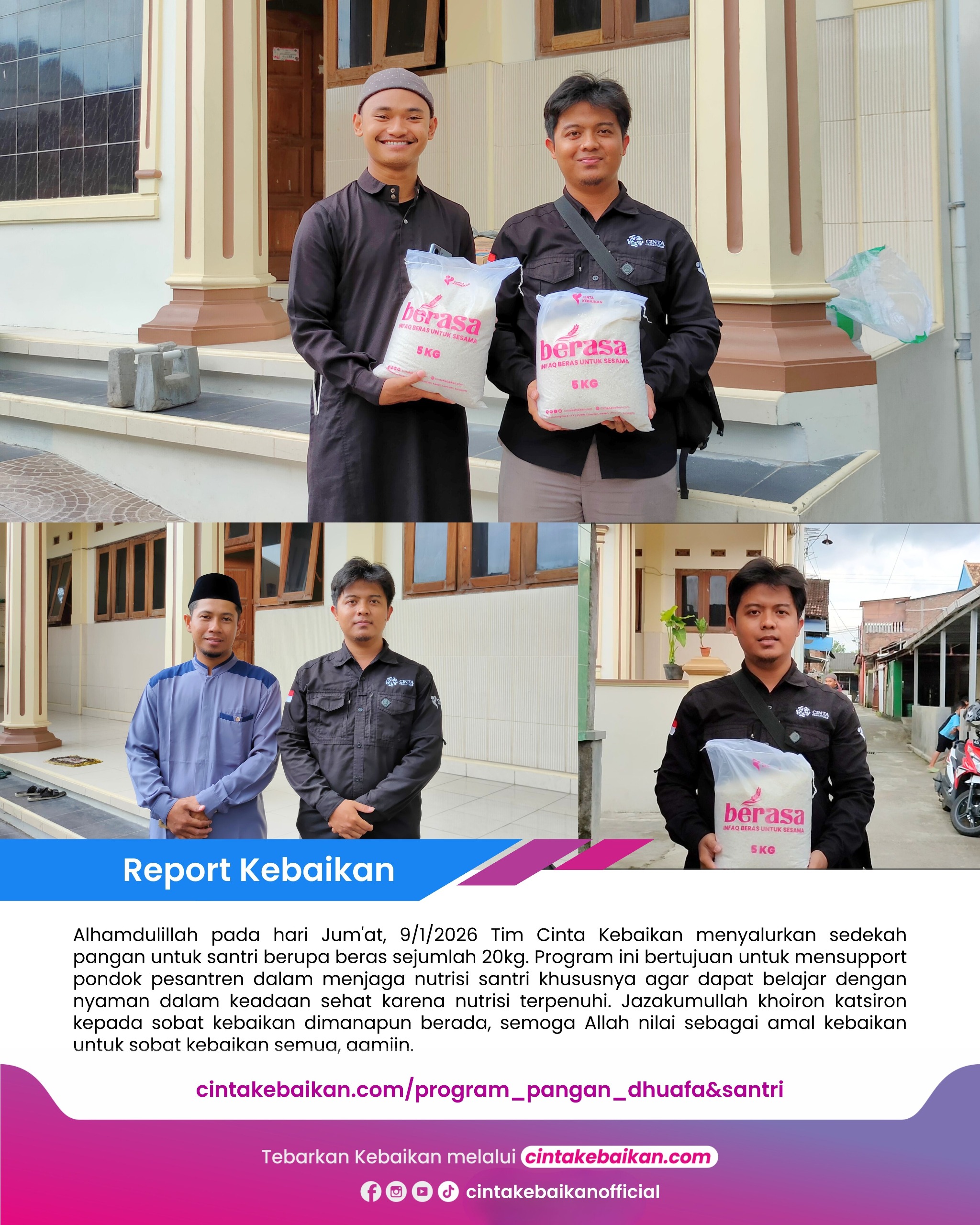 Pada Jumat, 9 Januari 2026, Tim Cinta Kebaikan menyalurkan sedekah pangan berupa beras sebanyak 20 kg untuk santri Pondok Al Mukmin.